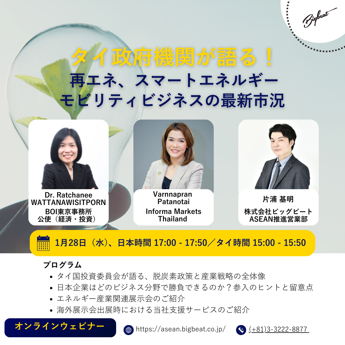 BtoB企業のマーケティング支援を行う広告会社、株式会社ビッグビート(本社:東京都千代田区)は、タイ国投資委員会(BOI)のご協力のもと、2026年1月28日(水)に「 ASEAN圏脱炭素市場に進出計画中の企業ご担当者必見!タイ政府機関が語る、再エネ、スマートエネルギー/モビリティビジネスの最新市況 」